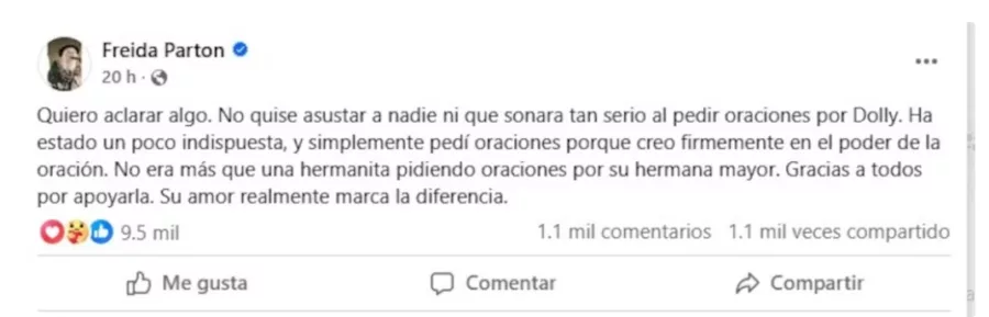 La reacción surgió luego de que su hermana Freida Parton pidiera oraciones por ella en redes sociales, lo que provocó preocupación entre los fans. “Últimamente todos piensan que estoy más enferma de lo que estoy. ¿Acaso me veo enferma?”, bromeó Dolly en el video, grabado desde el set de un comercial.