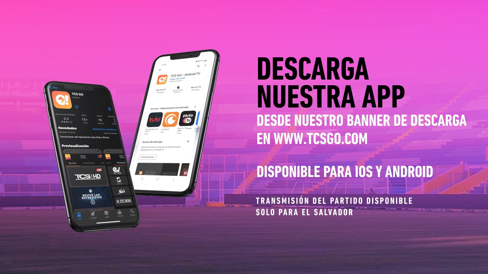 App de streaming: por TCS Go, gratis, solo para usuarios en El Salvador. Para descargarla, ingresa a tcsgo.com, dirígete al banner inferior que indica «descarga la app aquí»; presiónalo, y te llevará a la tienda de Apple Store o la descarga del archivo APK para Android. Procede a instalar y listo. También podrás verlo directamente desde tcsgo.com, iniciando sesión con tu usuario, o creando uno.