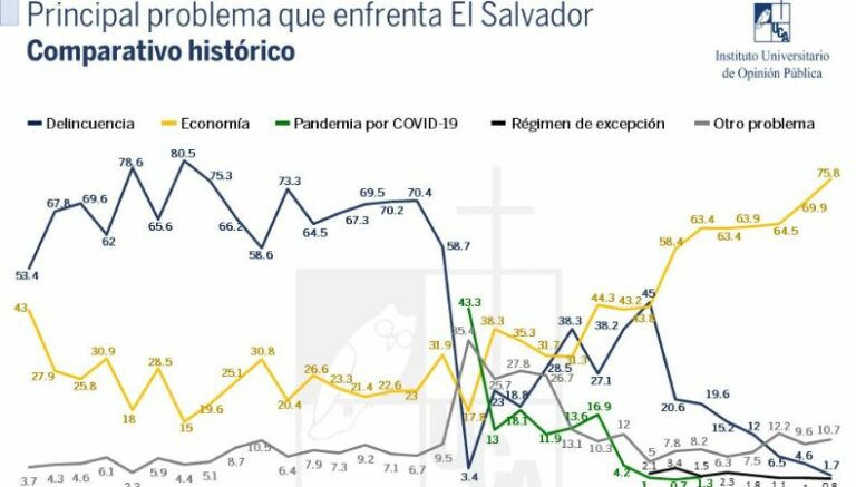 A nivel global, el 75.8% de la población encuestada respondió que la economía es el principal problema que enfrenta El Salvador, un dato que es la suma del 44.3% que dice que es la economía, el desempleo con un 16.4%, la pobreza con 7.1%, el alto costo de la vida con 6.6% y el 1.4% que cree que es la canasta básica.