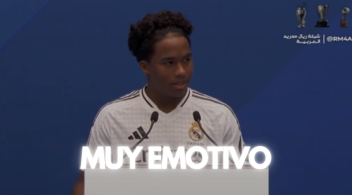 “Buenas tardes a todos. Quiero agradecer a todos haber venido al Bernabéu. No esperaba todo esto, tanta gente”, comenzó Endrick mientras los aficionados estallaban en una ovación que le hizo hacer una breve pausa mientras se le llenaban los ojos de lágrimas.
