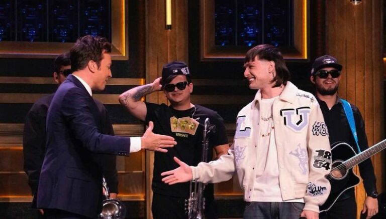Por parte, el presentador del programa dio una breve bienvenida al joven de 23 de años, antes que se presentara al escenario. “Aquí, en su debut en televisión estadounidense, interpretando la canción latina número uno en el país, ‘Ella Baila Sola’. Un aplauso para Peso Pluma”, exclamó Jimmy, mientras sostenía la portada del sencillo del mexicano.