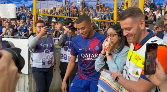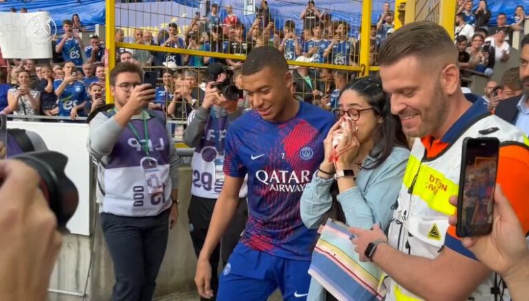 Este pasado sábado 27 de mayo, Kylian Mbappé, 24 años, celebró un nuevo título de Ligue 1 posterior al empate 1-1 del Paris Saint Germain contra el Racing de Estrasburgo. Previo al inicio del duelo, el delantero vivió un momento vergonzoso con una aficionada.