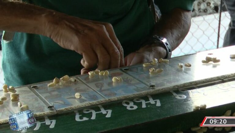 Cada mesa, de unos cinco metros de largo, tiene sobre sí más de un centenar de maíces y están repartidas 54 figuras que sirven para jugar la lotería en todas las mesas. Cuando el cantador va sacando cada una de la tómbola, él grita “con piquete” y los jugadores la señalan hasta que completen nueve de una ficha.
