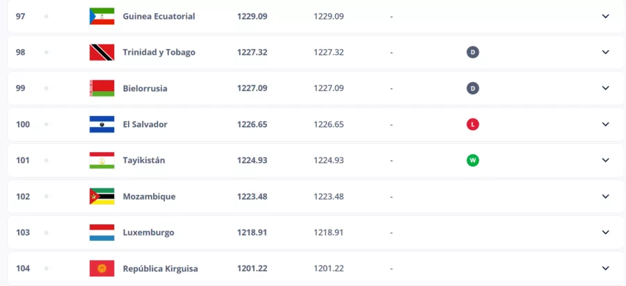 La selección que dirige Hernán Darío «Bolillo» Gómez se ubica en la posición 100 a nivel mundial con 1226.65 puntos.