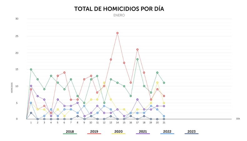 En los primeros 22 días del año, se contabilizan siete personas que han fallecido a causa de un homicidio provocado por actores delincuenciales. Las fechas a las cuales se atribuyen dichos homicidios están: