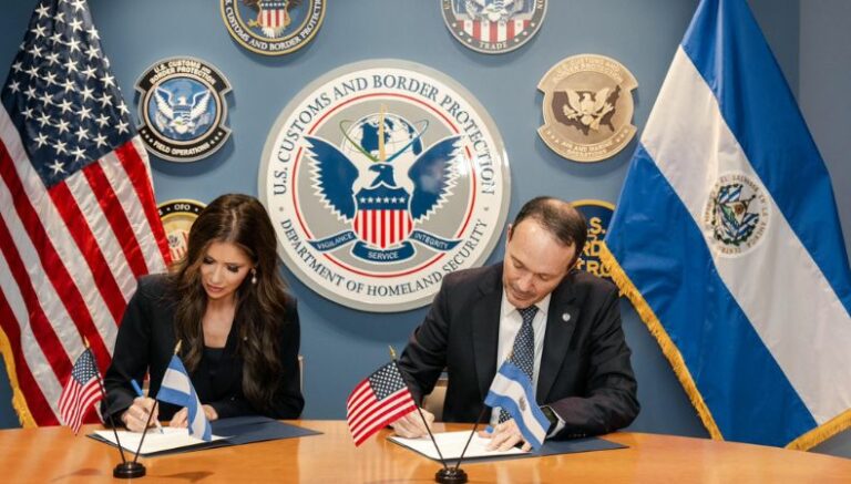 A través de su cuenta en X, Casa Presidencial confirmó que, durante la visita oficial del presidente Nayib Bukele a Estados Unidos, el ministro de Justicia y Seguridad Pública, Gustavo Villatoro, y la secretaria de Seguridad Nacional, Kristi Noem, firmaron el convenio para incorporar a El Salvador al programa Global Entry.