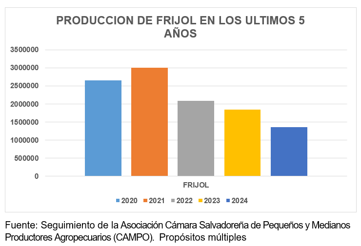 “En 2020, 2021 producimos arriba del consumo nacional. A partir de 2022 la producción va para abajo, en 2022 fue de 19 millones; en el 2023, 17 millones; y en el 2024, 15 millones de quintales. Tenemos ahorita un déficit de casi 10 millones de quintales”, dijo Luis Treminio, presidente de la Asociación Cámara Salvadoreña de Pequeños y Medianos Productores Agropecuarios (CAMPO).