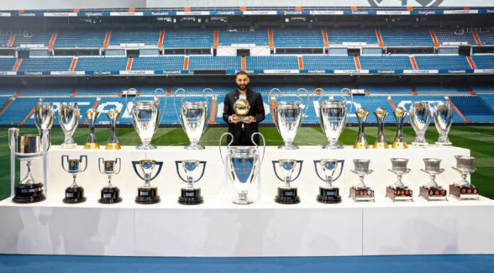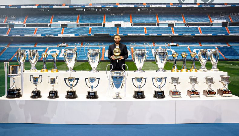 Al final del evento, el delantero francés posó junto a los 25 títulos conseguidos como madridista.