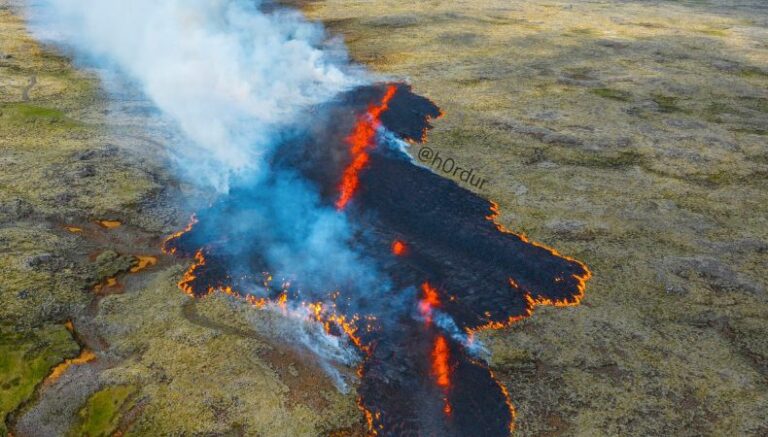 La lava ha causado una fisura de 200 metros de largo, que se ha formado en los alrededores del volcán. La península ha estado experimentando un «enjambre sísmico» entre Fagradalsfjall y Keilir, desde el 4 de julio de este año.