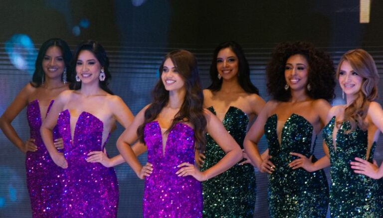 Por su parte, las jóvenes transmitieron todo el glamour que las caracteriza y que las hizo estar dentro de la competición. Además, lo colores que predominaron en la velada fueron: verde y morado con detalles brillantes que recorrieron las esbeltas figuras de las concursantes.