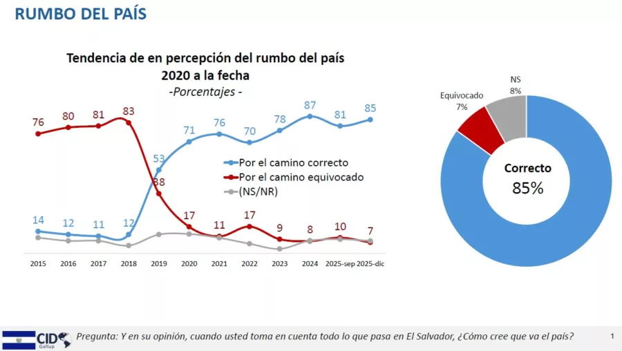 Como consecuencia de esto, revela CID Gallup, que el 85 % de los salvadoreños encuestados dicen que en El Salvador se continúa en un ambiente positivo, con relación a la percepción del rumbo de país (desde 2020 a la fecha).