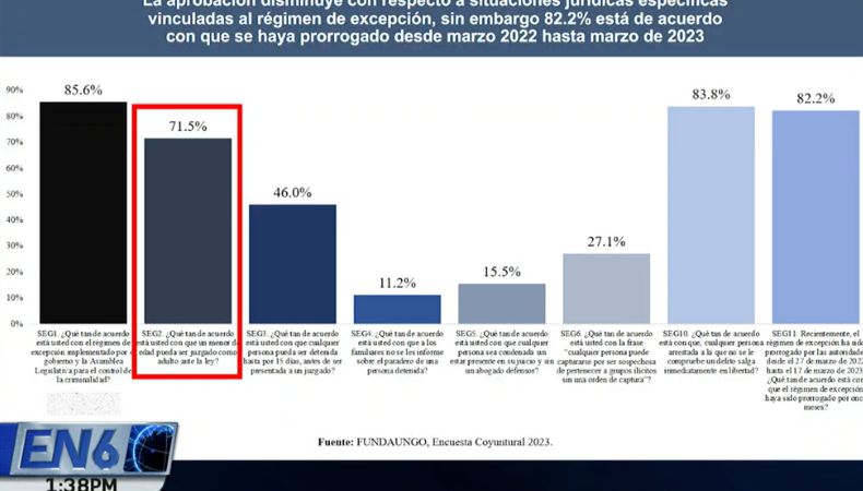 La organización Fundaungo publicó los resultados de su más reciente encuesta sobre la coyuntura del país, en la que se reveló el nivel de aceptación del régimen de excepción.
