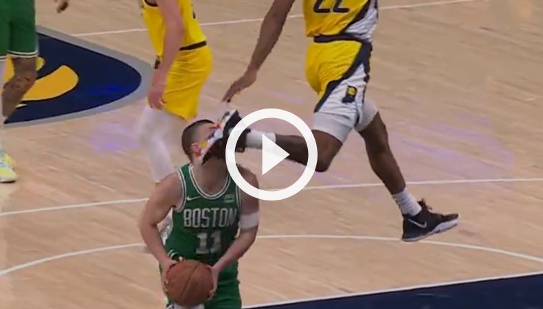 Sin embargo, Isaiah Jackson de los Pacers en el acto por defender su área y marcador no pudo frenarse y le dio una patada en la cara a Payton Pritchard, que intentó seguir con la jugada, pero le fue muy difícil.