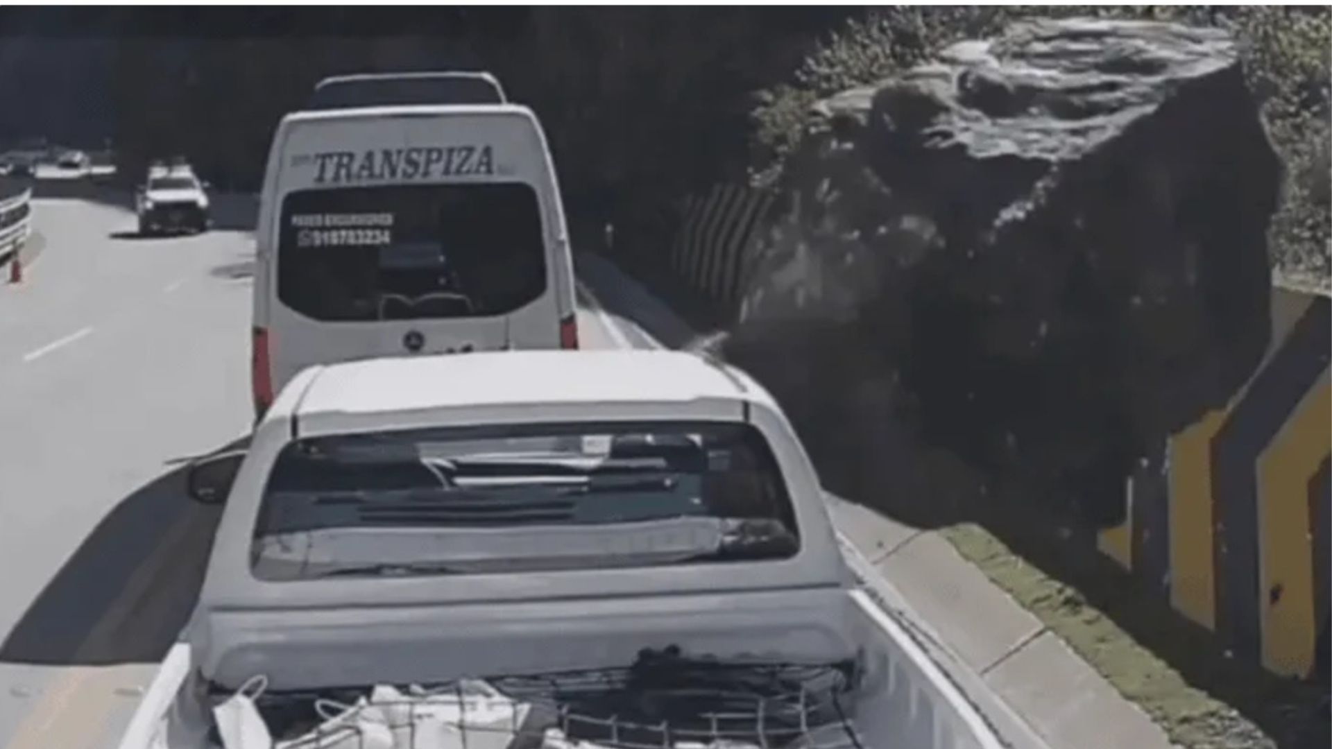 En las imágenes se puede ver como varias personas, en sus respectivos vehículos, esperaban que pase un auto en la dirección contraria cuando la camioneta en cuestión fue sorprendida por la enorme roca que se desprendió de una gran altura.