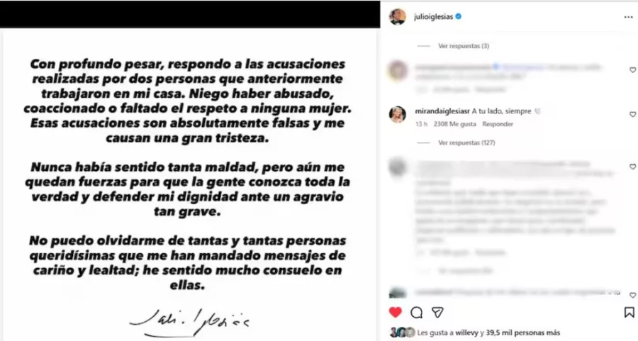 En su comunicado, Julio Iglesias negó los hechos y aseguró que defenderá su dignidad. “Niego haber abusado, coaccionado o faltado el respeto a ninguna mujer”, escribió. También agradeció a las personas que le han enviado mensajes de apoyo.