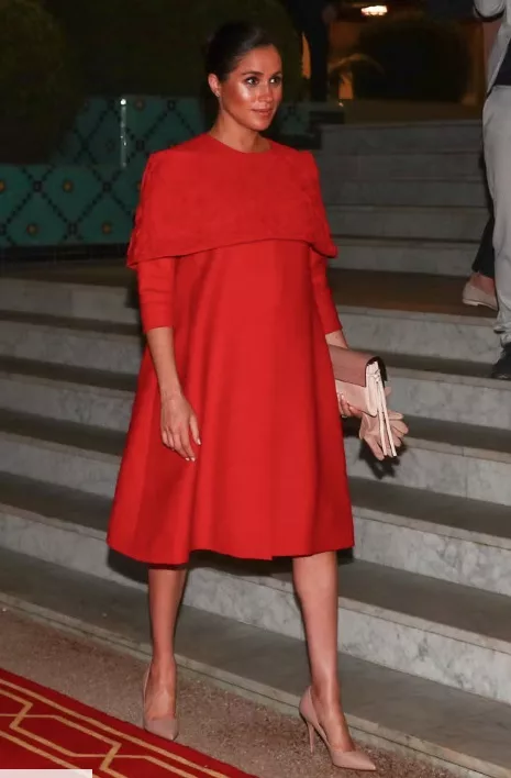 Meghan Markle en una visita a Marruecos en 2019. Embarazada, eligió un vestido midi rojo, de corte recto y mangas tres cuartos. La capa corta sobre los hombros dio estructura al diseño, que fue sobrio y sin bordados.