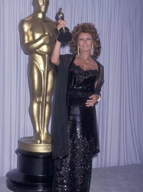 Sophia Loren en 1991, al recibir el Oscar honorífico. La actriz llevó un vestido largo negro cubierto de lentejuelas y bordados brillantes. El diseño, entallado y de escote recto, se complementó con una capa transparente y aretes largos.
