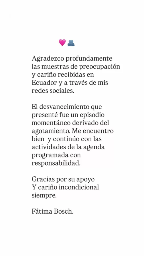 “Agradezco profundamente las muestras de preocupación y cariño recibidas en Ecuador y a través de mis redes sociales. El desvanecimiento que presenté fue un episodio momentáneo derivado del agotamiento. Me encuentro bien y continúo con las actividades de la agenda programada con responsabilidad”, escribió.