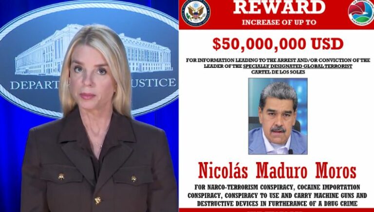 “Él es uno de los narcotraficantes más grandes del mundo y una amenaza para nuestra seguridad nacional. Por lo tanto, hemos duplicado su recompensa a $50 millones”, dijo Bondi. “Bajo el liderazgo del presidente Donadl Trump, Maduro no escapará de la justicia y será responsabilizado por sus crímenes despreciables”, agregó la Fiscal.