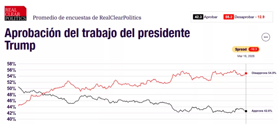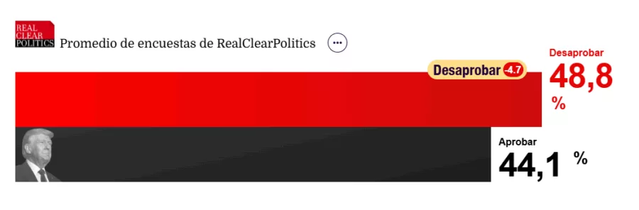 Por un lado, RealClearPolitics asegura que solo el 43.2%, menos de la mitad de los encuestados, aprueba el desempeño de Trump. Mientras que una mayoría del 54.3% le pone nota negativa.