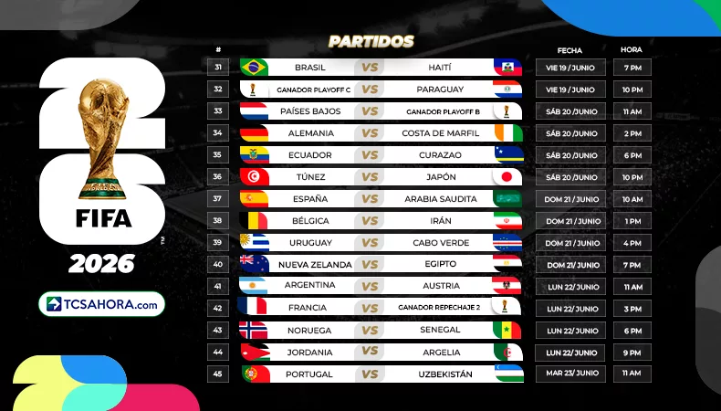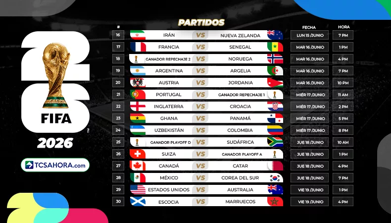 Apunta las fechas y horas de todos los partidos de la Copa Mundial de la FIFA 2026 a realizarse en Estados Unidos, México y Canadá.