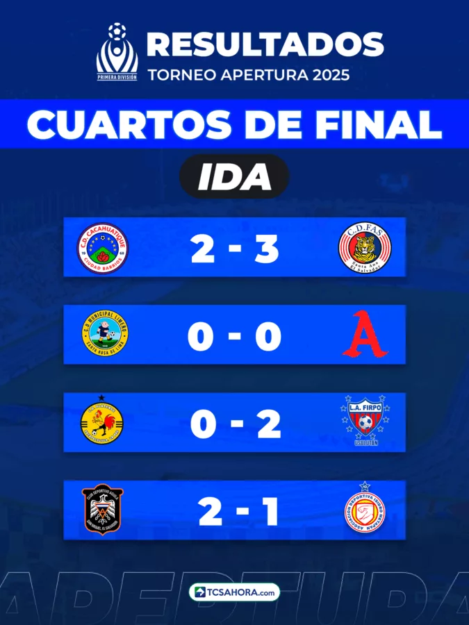 Este domingo se disputaron los encuentros de ida de los cuartos de final del Torneo Apertura 2025 de la Primera División, estos fueron los resultados.