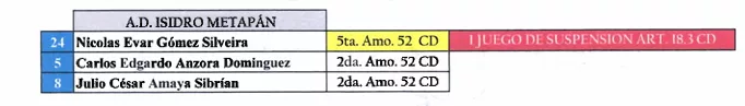 Nicolás Evar Gómez Silveira, de A.D. Isidro Metapán, fue castigado con un partido tras acumular su quinta amonestación, según el artículo 18.3 del Código Disciplinario.
