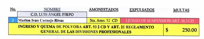 Firpo fue multado con 250 dólares por ingreso y quema de pólvora, conforme al artículo 93 numeral 2 del Código Disciplinario y el artículo 21 del Reglamento General de las Divisiones Profesionales.