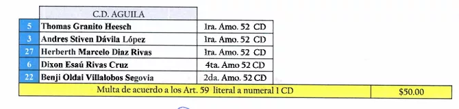 Por su parte, Inter F.A. y C.D. Águila recibieron una multa de 50 dólares cada uno, de acuerdo con el artículo 59 literal a numeral 1 del Código Disciplinario.