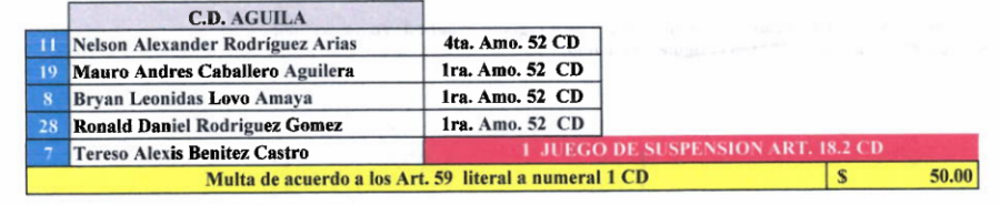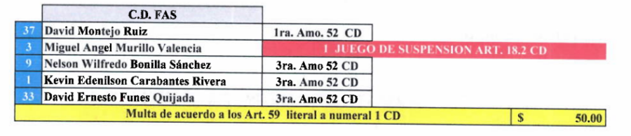 Además, el equipo deberá pagar una multa de $50 al tener cinco jugadores amonestados en el duelo ante los «gallos». Siendo la segunda jornada consecutiva que recibe dicha sanción.