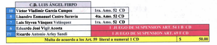 Por su parte, el líder Luis Ángel Firpo, no podrá contar con Eduardo Vigil, sancionado con un partido. El asistente técnico Ricardo Arley recibió un juego de sanción y el club una multa de $50.