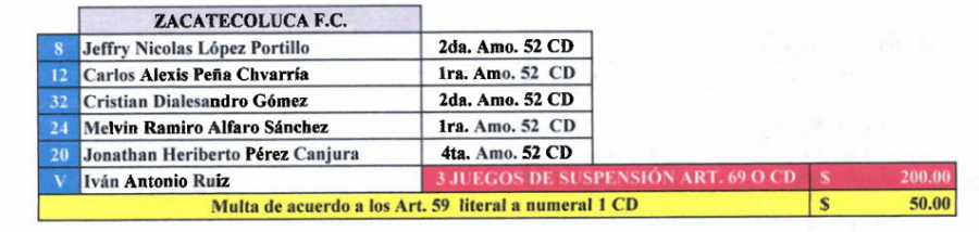 En Zacatecoluca FC, el asistente técnico Iván Antonio Ruíz fue sancionado con tres partidos y una multa de $200. Además, los «tecolotes» deberán pagar una multa de $50.