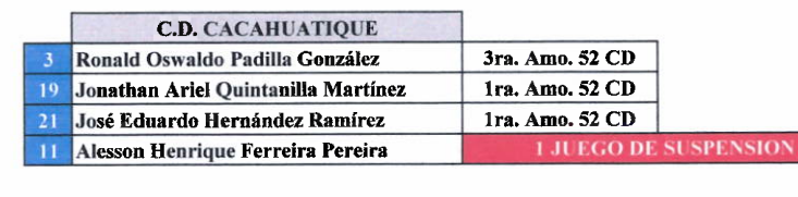 El director técnico de Zacatecoluca FC, Nelson Ancheta recibió dos juegos de sanción y una multa de $150 en el encuentro ante Cacahuatique. Todavía debe cumplir un partido más.