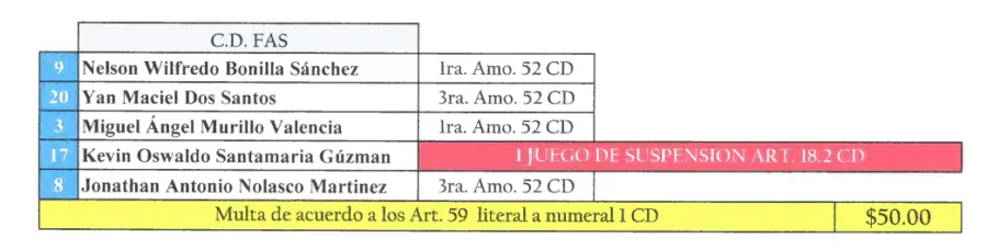 La Comisión Disciplinaria de la Federación Salvadoreña de Fútbol (FESFUT) dio a conocer el listado de jugadores sancionados para la jornada 16 del Torneo Clausura 2026.