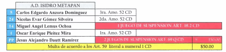 En Isidro Metapán, Miguel Lemus recibió un juego de suspensión y el preparador de porteros, Alejandro Dautt dos juegos de sanción y una multa de $150.00