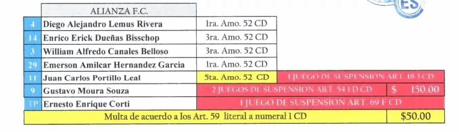 Por su parte, en Alianza FC, Juan Carlos Portillo fue sancionado con un partido, Gustavo Moura con dos juegos de sanción y una multa de $150.00. El técnico Ernesto Corti suspendido un partido.
