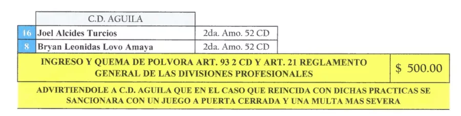 Finalmente, CD Águila recibió una multa de $500.00 por ingreso y quema de pólvora en el «Clásico Nacional» ante CD FAS.