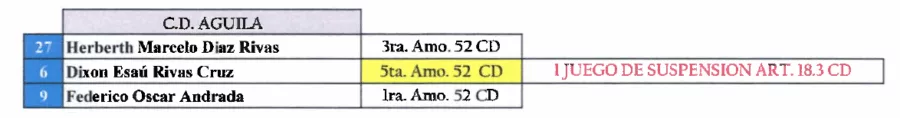 El futbolista de Club Deportivo Águila, Dixon Rivas, recibió un juego de sanción tras acumular su quinta amonestación en el encuentro ante Municipal Limeño.