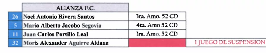 Moris Aguirre de Alianza FC recibió un partido de sanción luego de ser expulsado en el duelo ante CD Hércules.