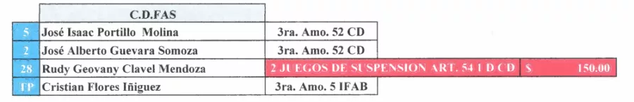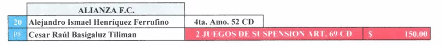 Finalmente, César Tiliman, preparador físico de Alianza, recibió dos juegos de sanción y una multa de $150.00
