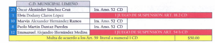 Los futbolistas de Municipal Limeño, Elvis Claros y Emmanuel Hernández, expulsados ante Firpo, recibieron un juego de sanción.