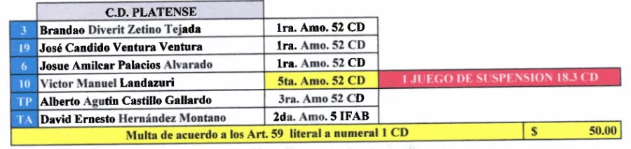 Misma situación para Víctor Landázuri, suspendido un partido por acumulación de tarjeta. CD Platense con multa de $50.00