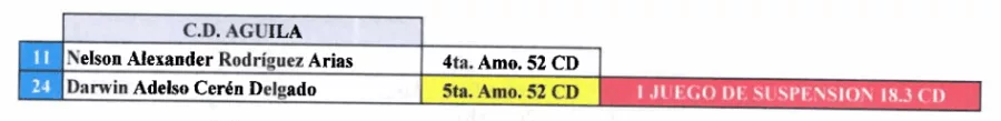 Por su parte, Darwin Cerén no estará en el juego entre CD Águila e Inter FA por acumulación de tarjetas.