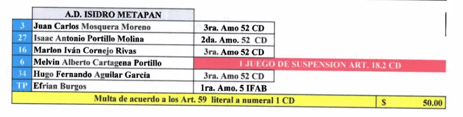 Finalmente, Melvin Cartagena recibió un juego de sanción y Metapán una multa de $50.00