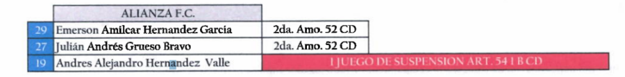 El defensa de Alianza FC, Andrés Hernández, recibió un juego de suspensión tras ser expulsado en el encuentro ante Luis Ángel Firpo.