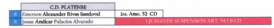 En Club Deportivo Platense, Josué Palacios, expulsado por doble amonestación ante Zacatecoluca FC, recibió un juego de sanción.
