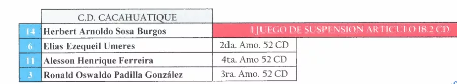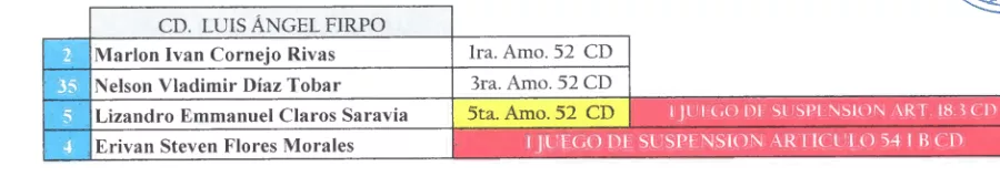 Además Lizandro Claros, por acumulación de tarjeta también recibió un partido de sanción.