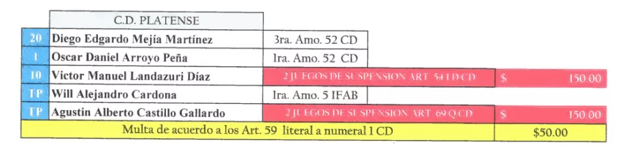 Asimismo, Platense deberá pagar $50.00 de multa.