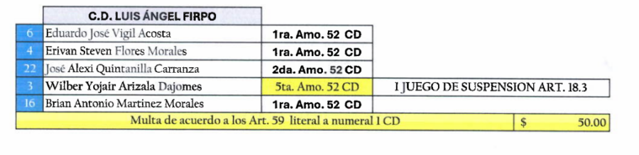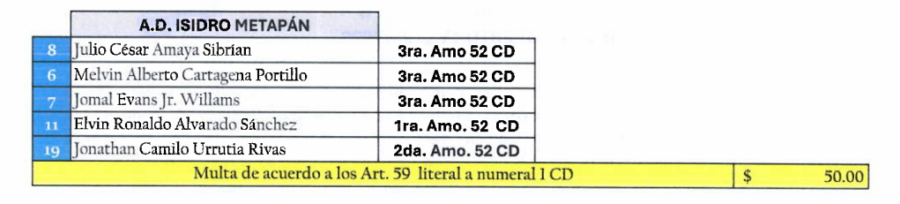 Además, Isidro Metapán también pagará una multa de $50 tener cinco jugadores amonestados en el partido ante Firpo.
