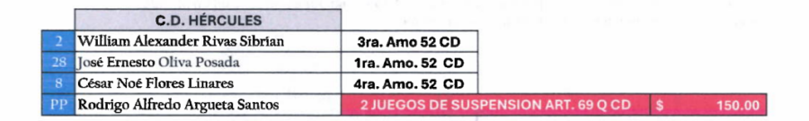 El asistente técnico de Club Deportivo Hércules recibió dos juegos de sanción tras ser sancionado en el encuentro ante CD Cacahuatique. Además una multa de $150.